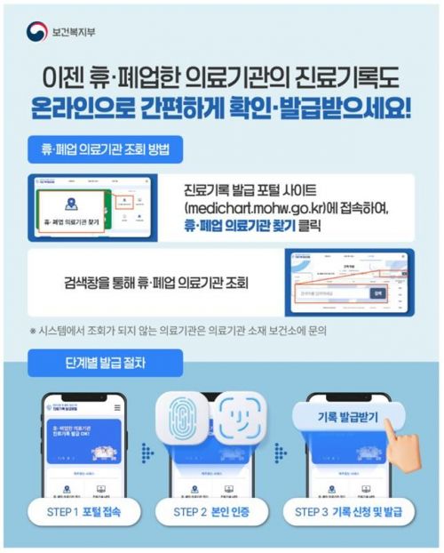 보건복지부와 한국보건의료정보원은 다니던 병원이 문을 닫아도 국민이 자신의 진료기록을 보다 편하게 확인할 수 있도록 휴·폐업 의료기관 진료기록보관시스템 개선을 추진한다고 3일 밝혔다.