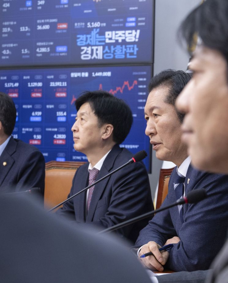 3일 국회에서 열린 더불어민주당 코리아 프리미엄 K자본시장 특별위원회 전체회의에서 정청래 대표 뒤로 이날 5000선을 회복한 코스피와 코스닥 지수가 표시돼 있다. 연합뉴스