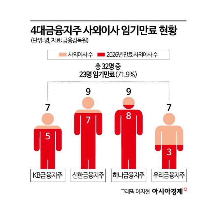 4일 금융권에 따르면 KB·신한·하나·우리·농협금융과 회장 선임 문제로 논란을 빚은 BNK금융까지 6개 금융지주 사외이사 46명 중 70%가 넘는 32명이 3월 임기 만료를 앞두고 있다.