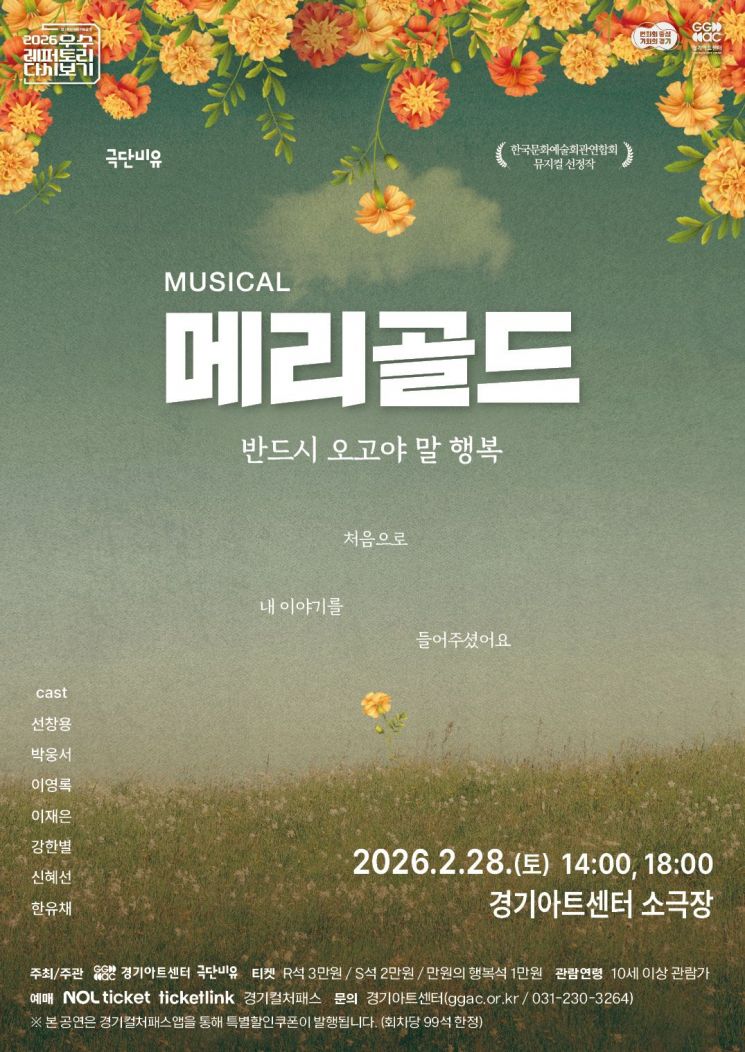 또 경기아트센터 소극장에서 공연하는 뮤지컬 '메리골드' 관람 할인 문화소비쿠폰이 지원된다. 공연은 이달 28일 토요일 오후 2시와 6시 총 2회다. 좌석 등급은 R석(3만원), S석(2만원), 만원의 행복석(1만원)으로 구성된다.