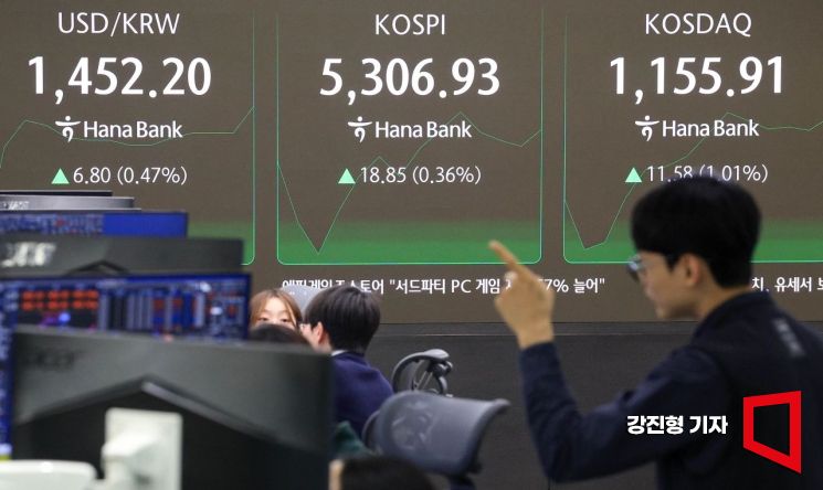 코스피 지수가 장 초반 하락 흐름을 보이다가 다시 상승 전환하며 5300선을 재돌파한 4일 서울 중구 하나은행 딜링룸에서 딜러들이 업무를 보고 있다. 이날 원달러 환율은 전 거래일 대비 4.5원 오른 1449.9원에 거래를 시작 했다. 2026.2.4 강진형 기자