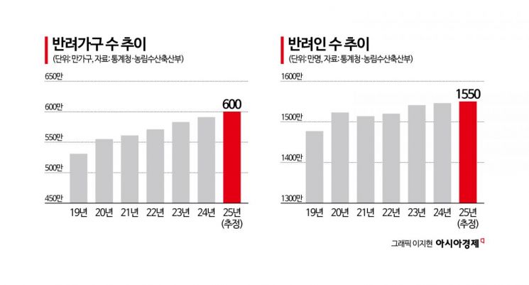 반려동물을 키우는 가구 수 역시 증가세다. 2019년 531만 가구였던 반려가구는 2024년 591만 가구, 지난해에는 600만 가구 수준으로 늘어났다. 반려인구도 같은 흐름을 보인다. 2019년 1477만명이던 반려인 수는 2023년 1541만명, 2024년 1546만명으로 늘었고, 지난해에는 1550만명 수준에 이를 것으로 추산된다. 단순 계산하면 국민 10명 중 3명이 반려동물과 함께 사는 셈이다.
