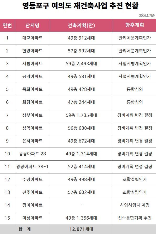 최호권 영등포구청장은 "핵심 업무지구인 여의도의 재건축사업은 주거와 업무, 상업 기능이 조화를 이루는 도시로 나아가는 중요한 전환점"이라며 "각 단지의 추진 단계에 맞춰 사업이 안정적으로 진행될 수 있도록 행정 지원을 이어가겠다"고 전했다.
