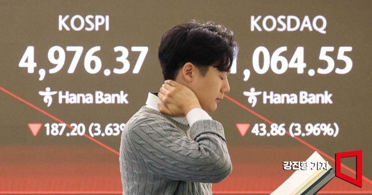 코스피 지수가 장중 5000선을 붕괴하며 나흘 만에 매도 사이드카가 발동된 6일 서울 중구 하나은행 딜링룸에서 딜러들이 업무를 보고 있다.