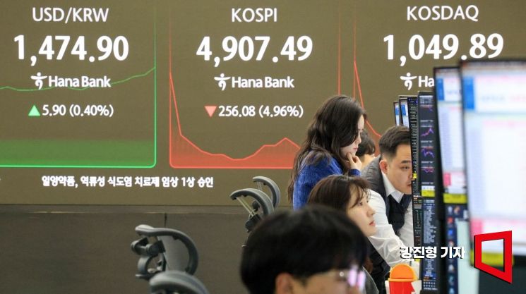코스피 지수가 장중 5000선을 붕괴하며 나흘 만에 매도 사이드카가 발동된 6일 서울 중구 하나은행 딜링룸에서 딜러들이 업무를 보고 있다. 2026.2.6 강진형 기자