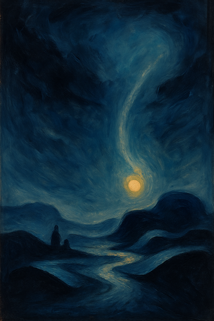 '그리고'의 영역에서 관객은 별과 어둠, 고독과 희망이 교차하는 이미지들과 마주한다. 인간의 형상은 자주 하늘을 올려다보거나, 빛을 품거나, 어둠 속에 서 있다. 설명은 없다. 다만 윤동주의 언어가 품었던 감정의 밀도가 시각적으로 번역된다. AI는 여기서 창작의 주체라기보다, 시적 정서를 증폭시키는 장치에 가깝다.