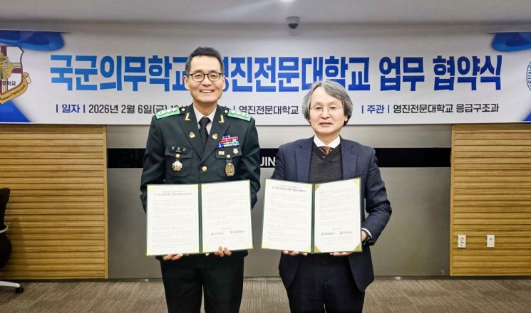 대구 영진전문대학교(총장 최재영)는 지난 6일 오후 복현캠퍼스 본관 회의실에서 국군의무학교(학교장 정준규)와 업무협약(MOU)을 체결하고, 응급의료 분야 전문 인력 양성과 민·군간 응급구조사의 실전 대응 역량 강화를 위한 협력에 나섰다.