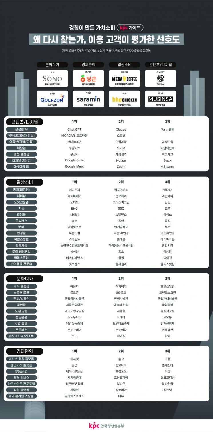 KPC 가이드는 온라인 검색량과 긍정 언급량이 많아 고객에게 회자되고 있는 4개(일상소비/문화여가/경제편의/콘텐츠·디지털) 부문의 36개 업종, 108개 기업(기관)을 대상으로 진행됐다. 온라인 조사를 통해 이용 경험이 있는 총 1만9486명의 고객이 참여했으며, 응답한 기업(기관)의 선호도를 100점 만점으로 산출했다.