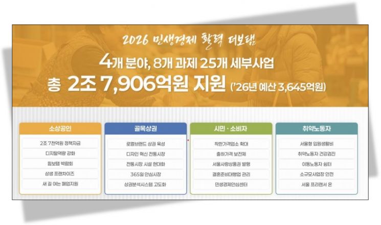 오세훈 서울시장은 9일 오전 서울시청에서 이같은 내용을 골자로 한 '2026년 민생경제 활력 더보탬' 추진 대책을 발표했다. 이번 지원책은 ▲소상공인 ▲골목상권 ▲소비자 ▲취약노동자 등 경제불황 속 가장 먼저 위기에 직면하는 이른바 '약한 고리'에 집중된다. 시는 총 2조7906억원을 투입해 4대 분야, 8개 핵심과제, 25개 세부사업을 추진한다.
