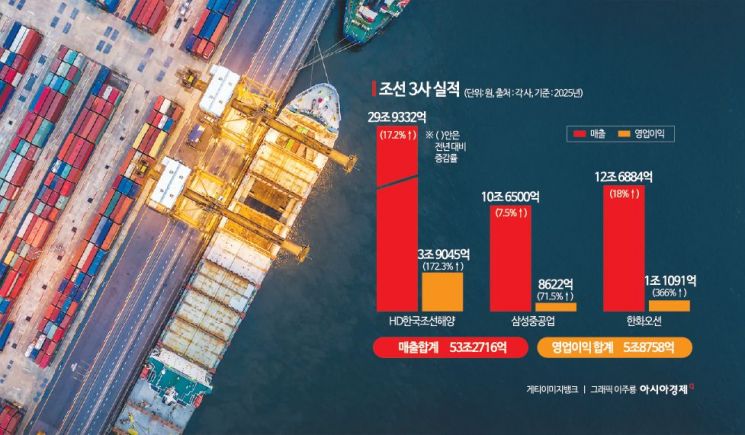 10일 조선업계에 따르면 작년 조선 3사 매출은 53조2716억원으로 집계됐다. 영업이익은 5조 8758억원이다. 2024년 대비 각각 15.2%, 170.1% 증가했다. 13년 만에 동반 흑자를 기록했던 2024년(2조1747억원)과 비교하면 두 배 이상 늘어났다.
