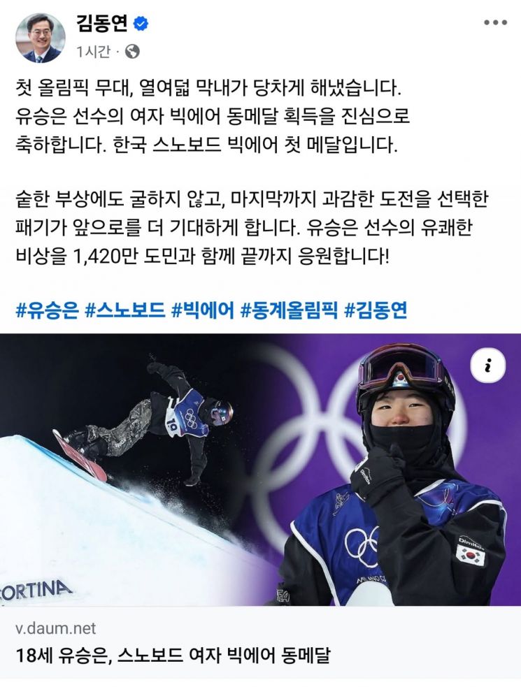 김동연 지사는 10일 자신의 사회관계망서비스(SNS)에 올린 글에서 "첫 올림픽 무대, 열여덟 막내가 당차게 해냈다"며 "유승은 선수의 여자 빅에어 동메달 획득을 진심으로 축하한다"고 전했다.