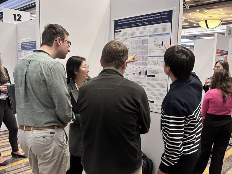 GC녹십자는 심포지엄에서 산필리포증후군 A형(MPSIIIA) 치료제 후보물질 'GC1130A'의 비임상 결과 포스터 발표를 진행했다. 산필리포증후군은 유전자 결함으로 체내에 '헤파란 황산염'이 축적돼 발생하는 질환으로 심각한 뇌 손상을 동반한다. GC녹십자는 GC1130A의 치료 효과를 높이기 위해 뇌실 내에 직접 약물을 투여하는 방식(ICV)으로 개발을 진행 중이다.