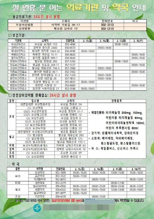 보건 분야에서는 보성아산병원과 삼호병원 응급실 24시간 운영, 당직의료기관 및 휴일 약국 지정 운영, 보건지소·보건진료소 주간 진료 체계를 유지한다. 감염병 대응을 위해 24시간 비상 방역 연락 체계도 가동한다.