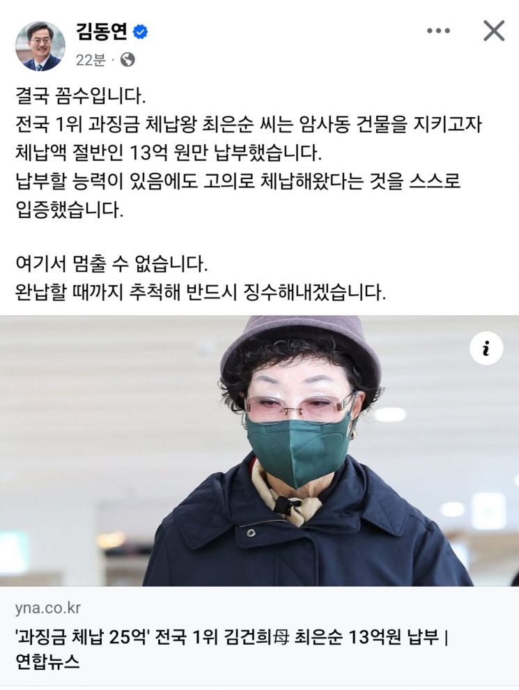 김동연 지사는 11일 자신의 사회관계망서비스(SNS)에 올린 글에서 "전국 1위 과징금 체납왕 최은순 씨는 암사동 건물을 지키고자 체납액 절반인 13억 원만 납부했다"며 "결국 꼼수"라고 비판했다.