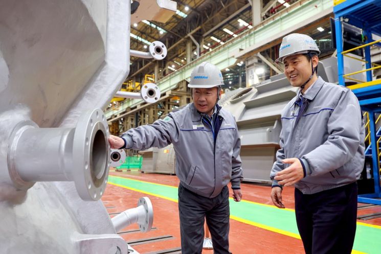 박 회장은 11일 경남 창원 두산에너빌리티 사업장을 방문해 에너지 사업 현황을 점검했다. 특히 최근 수주 소식이 잇따르며 분주해진 발전용 가스터빈 공장과 소형모듈원전(SMR) 주기기 제작라인을 집중적으로 둘러보면서 현장 상황을 세밀하게 살폈다.