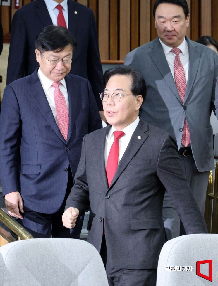 송 원내대표는 이날 오후 국회에서 의원총회를 열고 "오늘 의원총회에서 의원들의 총의를 수렴할 것"이라며 이같이 밝혔다. 앞서 국민의힘은 민주당이 전날 밤 국회 법제사법위원회에서 재판소원법 등을 일방 처리하자 이날로 예정됐던 이재명 대통령, 정청래 민주당 대표, 장동혁 국민의힘 대표 간 오찬 회동에 불참을 선언한 바 있다.
