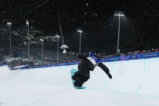 최가온이 이탈리아 리비뇨 스노파크에서 열린 2026 밀라노-코르티나 동계올림픽 스노보드 여자 하프파이프 결선에서 연기를 펼치고 있다. 리비뇨=EPA연합뉴스