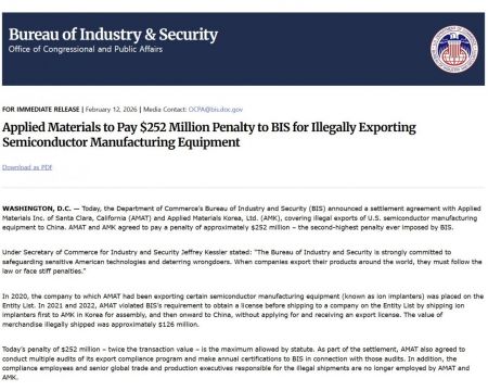 미국 상무부 산하 BIS는 중국에 미국산 반도체 제조장비를 불법으로 수출한 것과 관련해 어플라이드 머티어리얼즈 Inc(AMAT) 및 어플라이드 머티어리얼즈 코리아(AMK)와 합의했다고 지난 11일(현지시간) 발표했다
