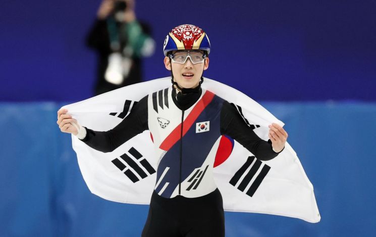 임종언이 13일(한국시간) 이탈리아 밀라노 아이스스케이팅 아레나에서 열린 2026 밀라노·코르티나 동계올림픽 쇼트트랙 남자 1000m 결승에서 1분24초611의 기록으로 동메달을 획득한 뒤 태극기를 몸에 두르고 기뻐하고 있다. [사진 제공= 연합뉴스]