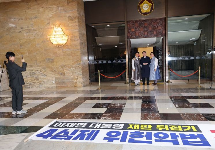 더불어민주당 이용선·이인영·박홍근 의원이 지난 12일 국회 로텐더홀에서 본회의장에 입장하기 전 한복 기념 촬영을 하고 있다. 그 앞에 국민의힘이 '4심제 위헌 악법 규탄 대회'를 열기 위해 둔 플래카드가 있다. 연합뉴스