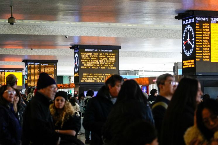 14일(현지시간) 이탈리아 로마에서 2026 밀라노·코르티나담페초 동계올림픽 방해를 노린 철도 파괴 공작으로 승객들이 테르미니 역에서 기다리고 있다. 로이터연합뉴스