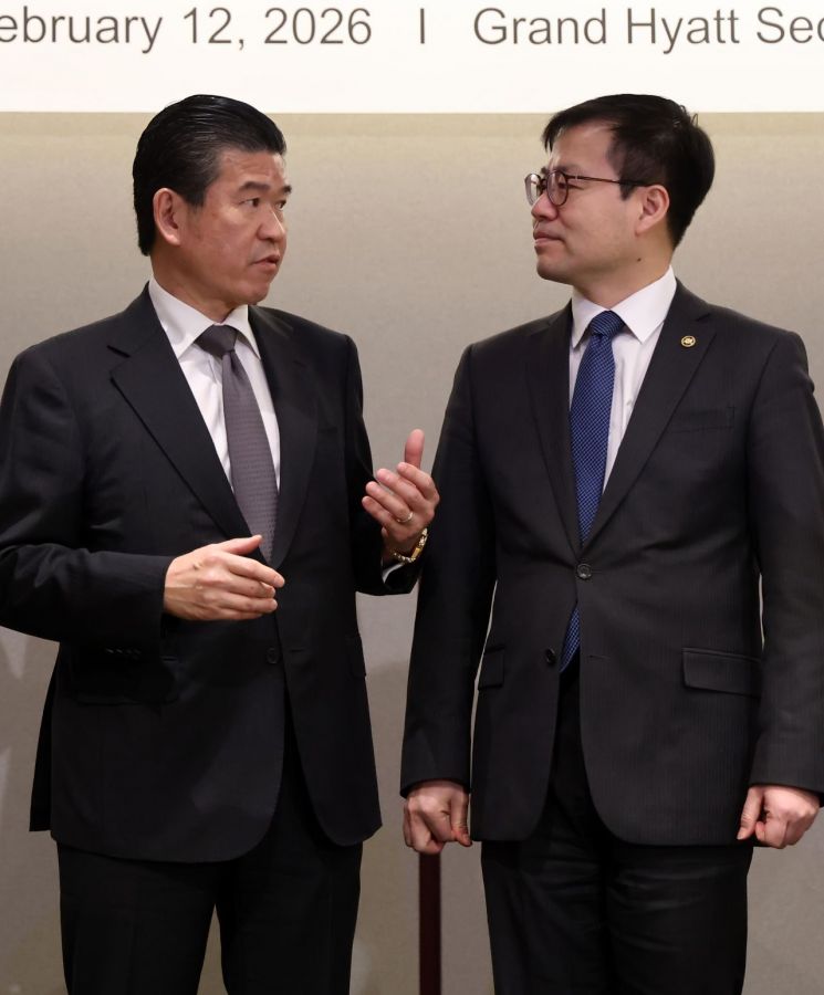 여한구 산업통상자원부 통상교섭본부장(오른쪽)과 제임스 김 주한미국상공회의소(AMCHAM) 회장이 12일 그랜드 하얏트 서울 호텔에서 열린 초청 간담회에서 기념촬영에 앞서 대화를 나누고 있다. 연합뉴스