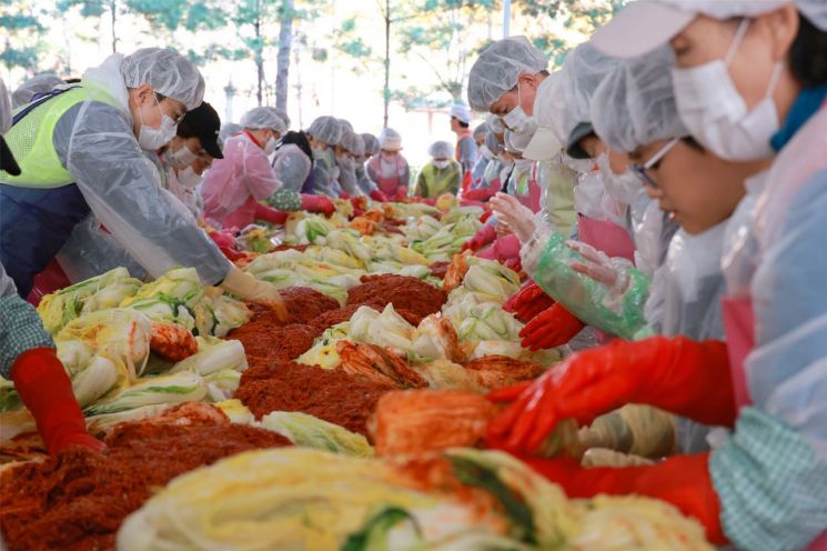 (재)하남시자원봉사센터(이사장 이현재)가 시민의 일상과 봉사를 하나로 엮어내며 2025년 연간 참여 인원 10만8252명이라는 기념비적인 성과를 달성했다. 사진은 김치를 담그는 (재)하남시자원봉사센터 회원들의 모습. 하남시 제공