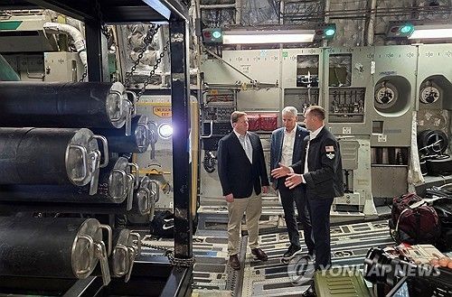 크리스 라이트 미국 에너지부 장관(가운데)과 마이클 더피 국방부 획득운영유지 담당 차관(왼쪽)이 15일(현지시간) 초소형 원자로를 싣고 캘리포니아주 마치 공군 기지에서 유타주 힐 공군 기지로 이동 중인 미군 C-17 수송기 내부에서 원자로를 살펴보고 있다. 로이터연합뉴스