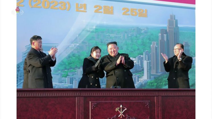 김정은 북한 국무위원장이 부인 리설주, 딸 주애와 함께 지난 16일 평양 화성지구 4단계 1만 세대 살림집 준공식 경축공연을 관람하던 중 주애가 김 위원장이 펼친 손을 두 손으로 어루만지고 있다. 조선중앙TV 연합뉴스