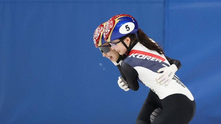 최민정(오른쪽)이 19일(한국시간) 이탈리아 밀라노 아이스스케이팅 아레나에서 열린 2026 밀라노·코르티나 동계올림픽 쇼트트랙 여자 3000m 계주에서 금메달을 확정지은 뒤 김길리와 함께 기뻐하고 있다. 연합뉴스
