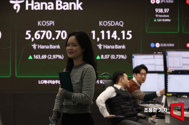 코스피가 장중 사상 첫 5600선을 돌파한 19일 서울 하나은행 본점 딜링룸에서 직원이 증시와 환율 등을 모니터하고 있다 이날 코스피는 오전 9시 2분 현재 전장보다 150.70포인트(2.74%) 올라 강세를 이어가고 있다. 조용준 기자