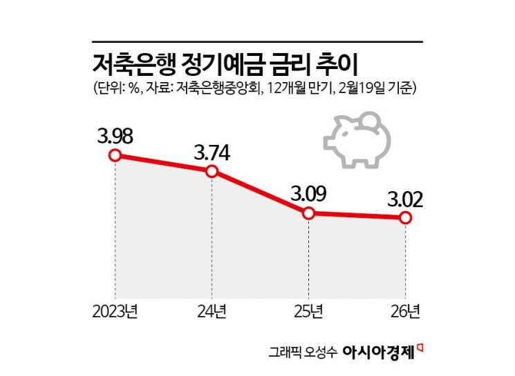 20일 저축은행중앙회에 따르면 국내 79개 저축은행의 12개월 만기 정기예금 평균 금리는 전날 기준 연 3.02%를 기록했다. 1년 전 3.09% 대비 0.07%포인트 낮은 수준이다.