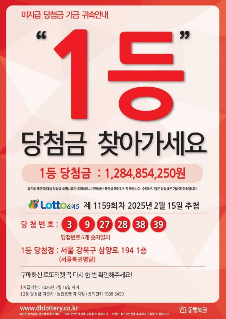 20일 동행복권에 따르면 1159회 로또복권 1등 당첨자 1명(수동 선택)이 그동안 찾아가지 않았던 당첨금 12억8485만원을 수령했다.