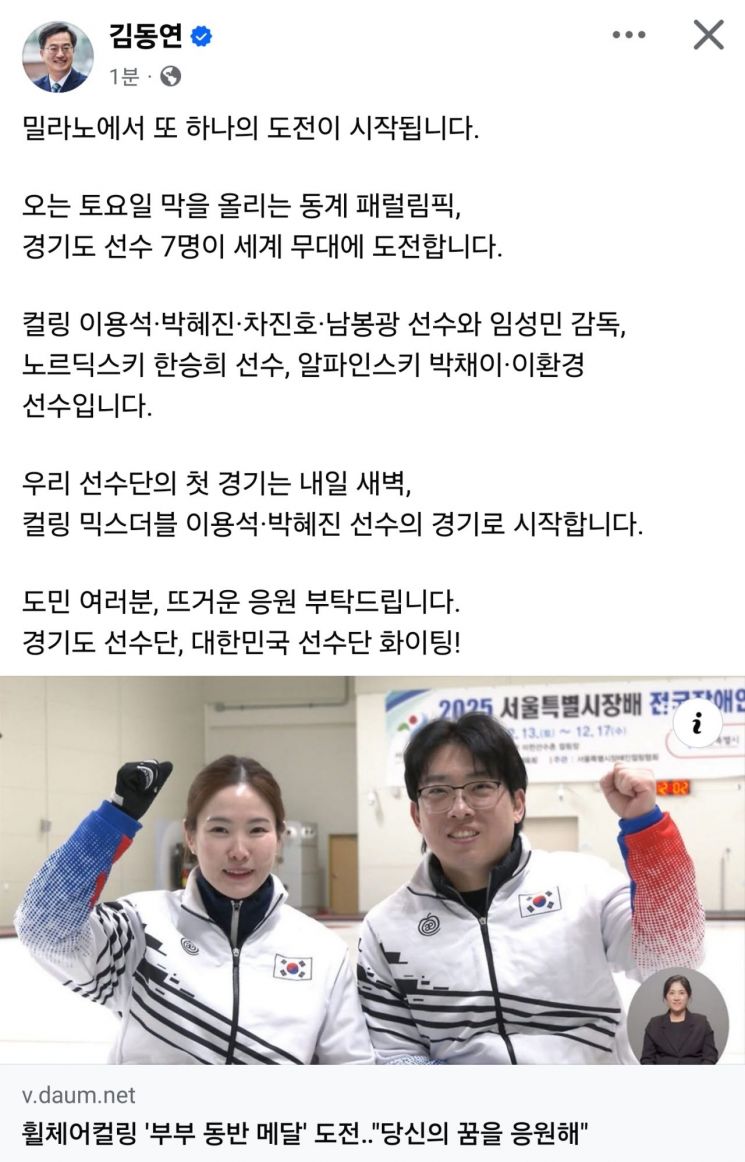 김동연 지사는 4일 자신의 사회관계망서비스(SNS)에 올린 글에서 "밀라노에서 또 하나의 도전이 시작된다"며 "오는 토요일 막을 올리는 동계 패럴림픽, 경기도 선수 7명이 세계 무대에 도전한다"고 전했다.