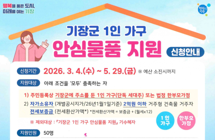 부산 기장군, 1인 가구 안심물품 지원… 50가구 선정