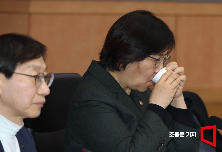 정은경 보건복지부 장관이 5일 서울 종로구 정부서울청사 별관에서 열린 2026년도 제2차 국민연금기금운용위원회에 참석해 물을 마시고 있다.