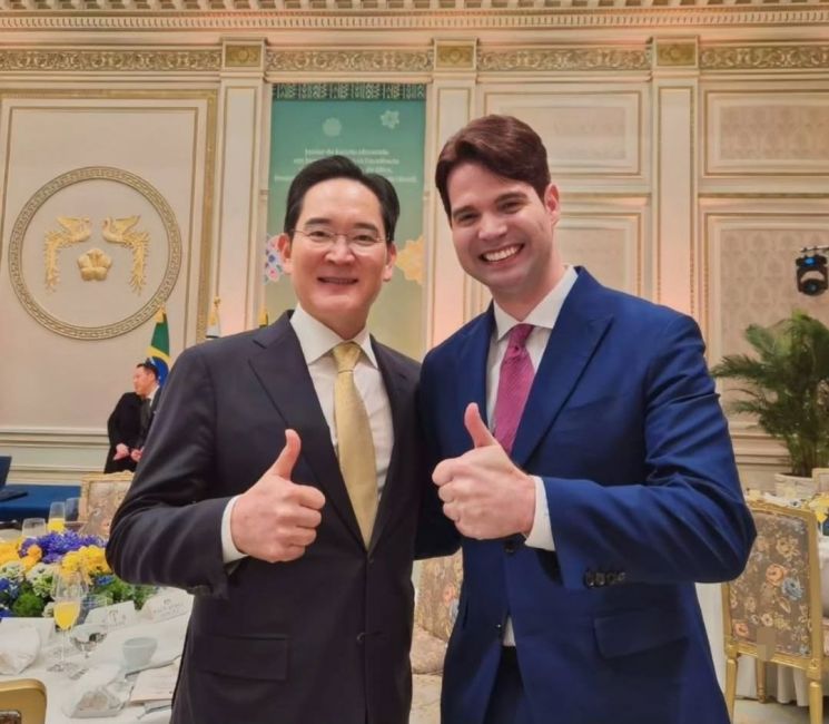 지난달 23일 청와대 영빈관에서 열린 한·브라질 국빈 만찬에서 삼성전자 이재용 회장(왼쪽)과 브라질 출신 방송인 카를로스 고리토가 함께 기념사진을 찍고 있다. 카를로스 고리토 인스타그램