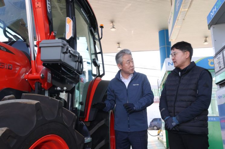 강호동 농협중앙회장(왼쪽)이 7일 동춘천농협에서 운영하는 농협주유소를 방문해 국제유가 상승에 따른 영농비 부담 등 현장의 애로사항을 청취하고 있다. 농협중앙회