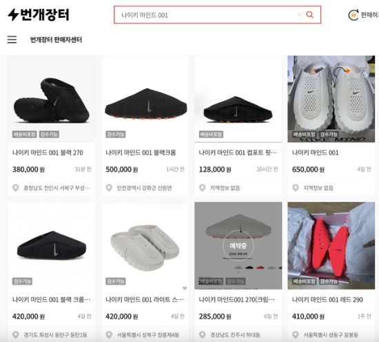 8일 중고거래 플랫폼 번개장터에서는 '나이키 마인드 001' 제품이 10~30만원대에 거래되고 있다. 일부 판매자는 50만원에 매물을 올리기도 했다. 크림에서도 20~30만원대에 거래가 형성돼 있다. 해당 제품 정가는 11만9000원으로 최고 4배가량의 웃돈이 붙은 셈이다.
