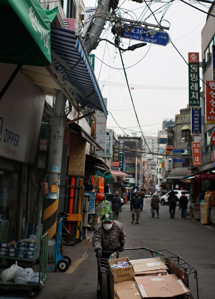 길을 침범하면 통행로가 좁아질 것이었고 건물에 전봇대를 붙일 수도 없었다. 굽은 전봇대라는 궁여지책으로 일단 문제를 해결했다. 통념을 벗어나면 길이 보일 때가 있고, 모든 굽은 것들에는 이유가 있다. (서울 종로)