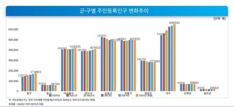 조사 결과를 보면 인천은 인구가 지속해서 증가해 300만명을 유지하고 있으나 지역별 인구 증감 양극화가 두드러지게 나타났다. 중구, 서구, 연수구 등 신도시 개발이 활발한 지역은 각 25%, 19.7%, 5.3% 증가했지만 동구, 남동구, 계양구는 -9.2%, -8.4%, -6.4%씩 인구 감소세가 뚜렷하다.