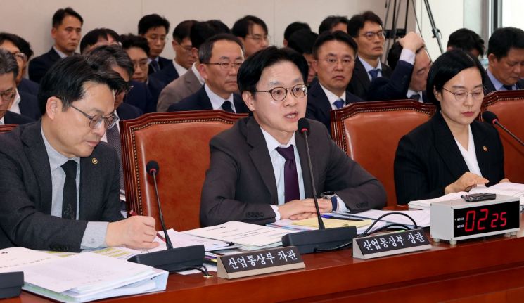 김정관 산업통상부 장관이 9일 국회에서 열린 산업통상자원중소벤처기업위원회 전체 회의에서 의원들의 질의에 답하고 있다. 왼쪽부터 문신학 산업통상부 차관, 김 장관, 한성숙 중소벤처기업부 장관. 연합뉴스.