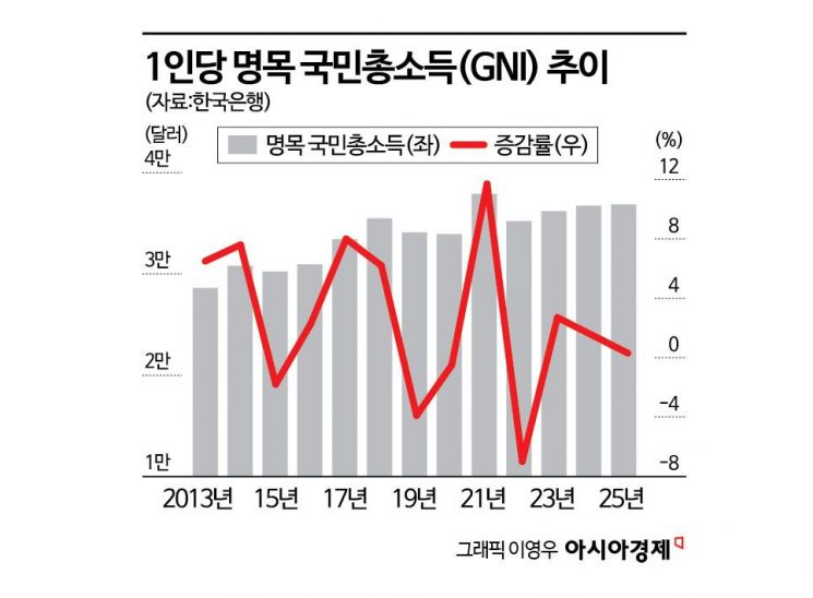 우리나라 1인당 GNI는 2014년(3만798달러) 처음 3만달러 시대를 연 후 2021년 3만7898달러까지 몸집을 키웠다. 그러나 2022년 환율이 급등하며 3만5229달러까지 떨어졌고, 2023년 3만6000달러(3만6195달러)를 회복한 후 소폭 상승세를 이어가며 3년째 3만6000달러대에 머물고 있다.