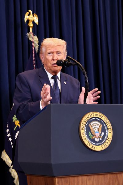 도널드 트럼프 미국 대통령이 9일(현지시간) 플로리다주 마이애미의 자신이 소유한 골프장에서 기자회견을 하고 있다. 이는 미국과 이스라엘의 이란 공습으로 시작된 전쟁이 발발한 이후 처음 갖는 기자회견이다. 로이터연합뉴스