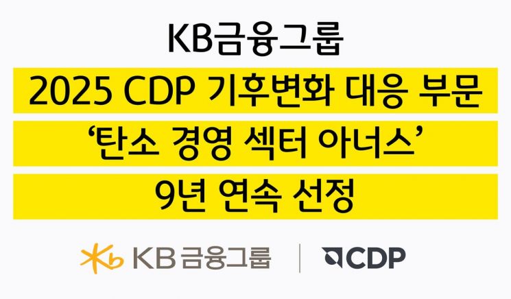 KB금융은 지난해 12월 '2025 CDP 기후변화 대응 부문(Climate Change)' 평가에서도 최상위 등급인 '리더십(Leadership) A'를 2년 연속 획득했다. 기후변화 대응을 위한 지배구조 체계, 경영전략 수립, 탄소감축목표·성과 등에서 높은 평가를 받았다.