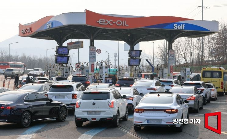 국제 유가가 100달러를 돌파하며 전국 주유소 기름값이 상승하고 있는 9일 서울 서초구 만남의광장 주유소에 기름값이 더 오르기 전에 주유하려는 차들이 줄지어 서 있다. 2026.3.9 강진형 기자