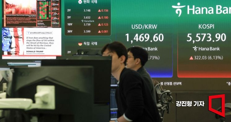 도널드 트럼프 미국 대통령의 종전 임박 발언에 유가가 안정되며 코스피 지수도 장 초반 급반등에 매수 사이드카가 발동된 10일 서울 중구 하나은행 본점 딜링룸에서 딜러들이 업무를 보고 있다. 이날 원달러 환율은 전 거래일 대비 24.7원 내린 1470.8원에 거래를 시작했다. 2026.3.10 강진형 기자