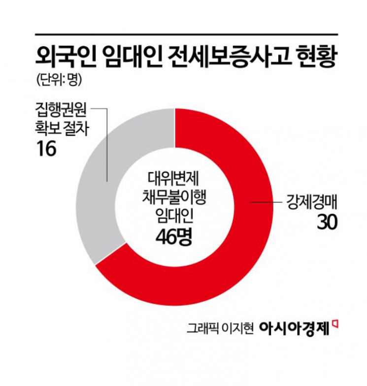 11일 HUG 집계를 보면, 지난달까지 공사에 채무를 상환하지 못한 외국인 임대인 수는 총 46명으로 확인됐다. 이 가운데 30명이 소유한 주택이 경매에 넘어갔다. 나머지 16명에 대해서는 강제경매에 넘기기 위해 집행권원을 확보하는 절차를 밟고 있다. HUG가 이 과정에서 임차인에게 대신 지급한 대위변제 금액은 167억원으로 집계됐다.