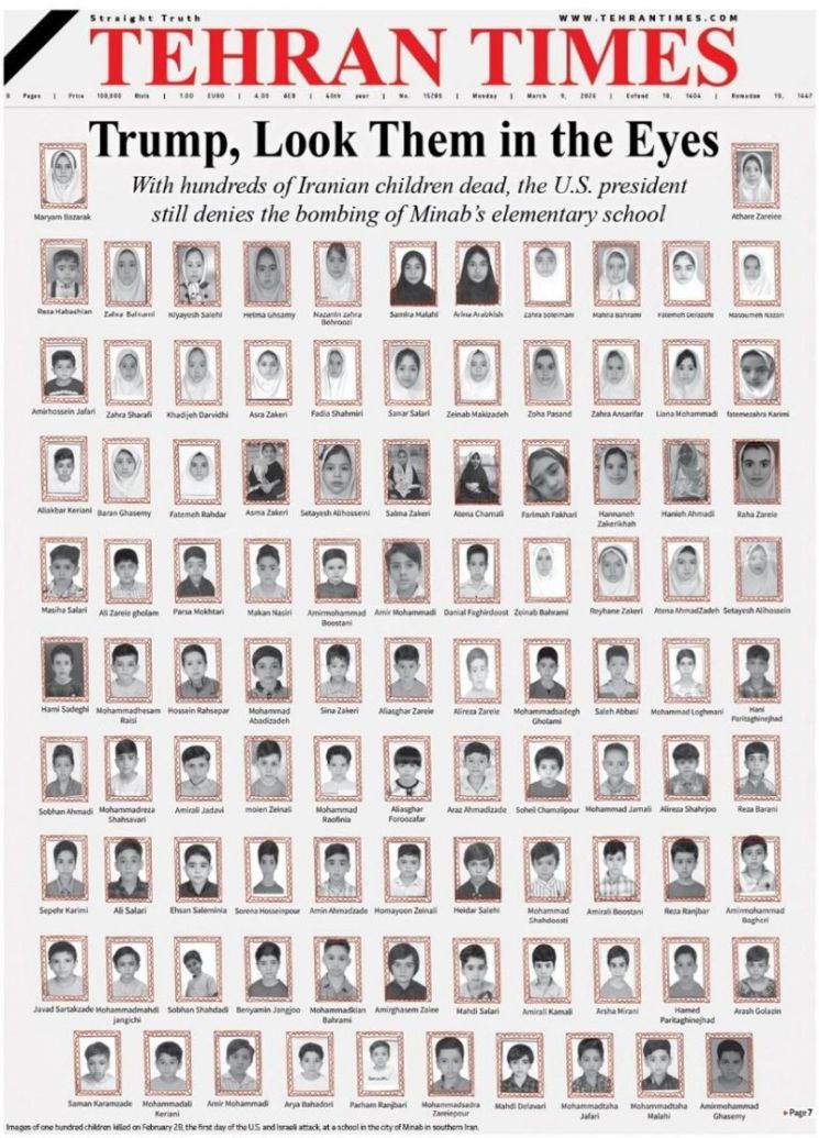9일(현지시간) 테헤란타임스는 사회관계망서비스(SNS)를 통해 "내일 자 테헤란타임스에서 진실을 확인하라"며 신문 1면 지면을 공개했다. 이 신문은 "트럼프, 이들의 눈을 보라"는 제목을 달고 미나브 초등학교 희생자 150명의 얼굴을 실었다.