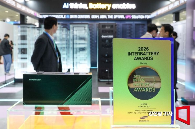 11일 서울 강남구 코엑스에서 열린 '인터배터리 2026'에서 삼성SDI의 고에너지 각형 배터리가 전시돼 있다.